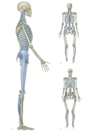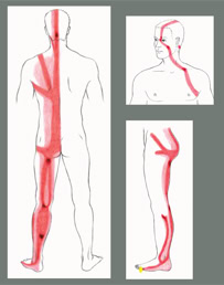 The four images below are a mixture of diagrams from two sources, one being “Anatomy Trains” a book by Thomas Myers first published around 2012 and the second source a Chinese Text called the Ling Shu, the earliest written records of which go back to about 600AD. The Anatomy Trains structures (in blue) were based upon detailed dissection, the origin of the Ling Shu physical model known as Jing Jin (in red) is less certain but it most likely derived from a mixture of knowledge gained through the practise of Yogic style exercise (Dao Yin) and the delivery of manual physical therapy (An Mo). Looking at the diagrams we can see that the two sources produced concepts of structure that are very similar and demonstrate the same continuity through the body.